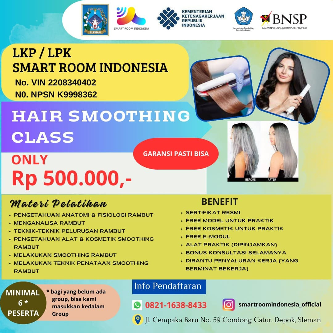 Hair Smoothing Class dilaksanakan 2 hari, Durasi: 4 Jam (1 x pertemuan) Harga Pelatihan: Rp 500.000 Benefit: 1. Sertifikat resmi 2. Free model untuk praktik 3. Free kosmetik untuk praktik 4. Free E-modul 5. Alat praktik dipinjamkan 6. Bonus konsultasi selamanya 7. Dibantu penyaluran kerja (yang berminat bekerja)