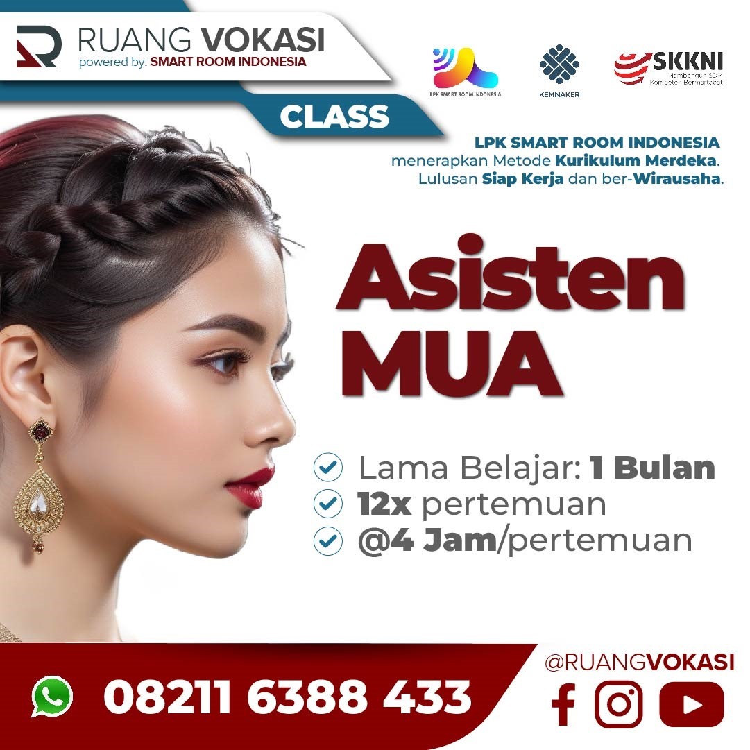 Kelas Asisten MUA: Durasi: 1 bulan; 1 minggu: 3x pertemuan (1 bulan = 12x pertemuan) Durasi = 4 jam/pertemuan; waktu operasional: 08.00 - 16.30; Benefit: Sertifikat resmi, garansi PASTI BISA, Konsultasi seumur hidup