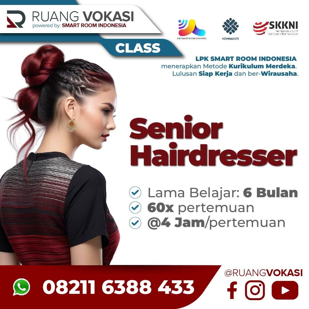 Kelas Senior Hairdresser: Durasi: 6 bulan 1 minggu: 5x pertemuan (5 Bulan Pelatihan; 1 Bulan Magang); Durasi = 4 jam/pertemuan; waktu operasional: 08.00 - 16.30; Benefit: Sertifikat resmi, Biaya dapat di Cicil Per Bulan, garansi PASTI BISA, Magang ditempatkan di salon yang bermitra dengan LKP SMart Room indonesia, Selesai Pelatihan, dapat disalurkan kerja di Salon yang bermitra dengan LKP SMart Room indonesia, Konsultasi seumur hidup