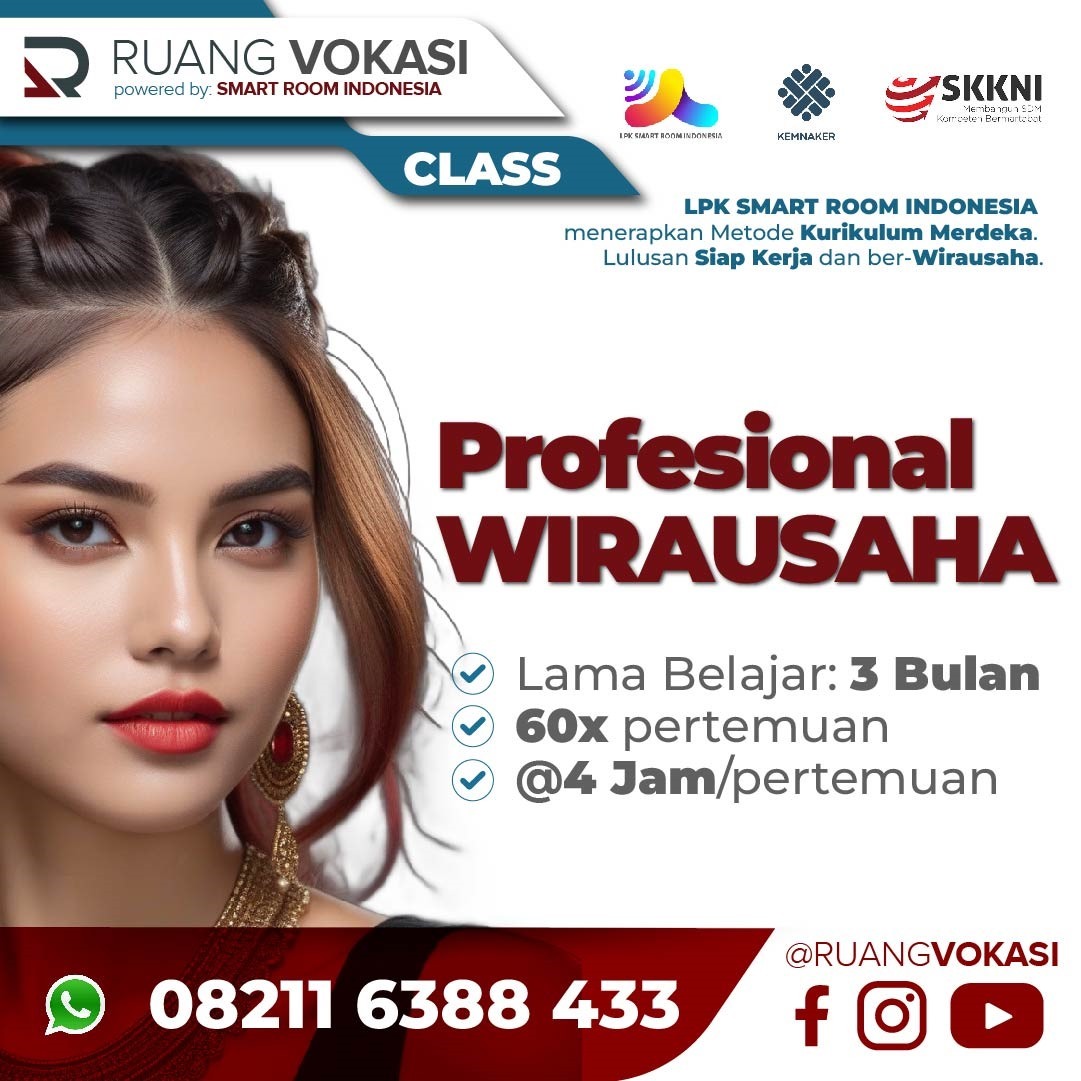 Kelas Wirausaha Durasi: 3 bulan 1 minggu: 5x pertemuan (3 bulan = 60x pertemuan); Durasi = 4 jam/pertemuan waktu operasional: 08.00 - 16.30 Benefit: Sertifikat resmi, Biaya dapat di Cicil Per Bulan, garansi PASTI BISA, Konsultasi seumur hidup