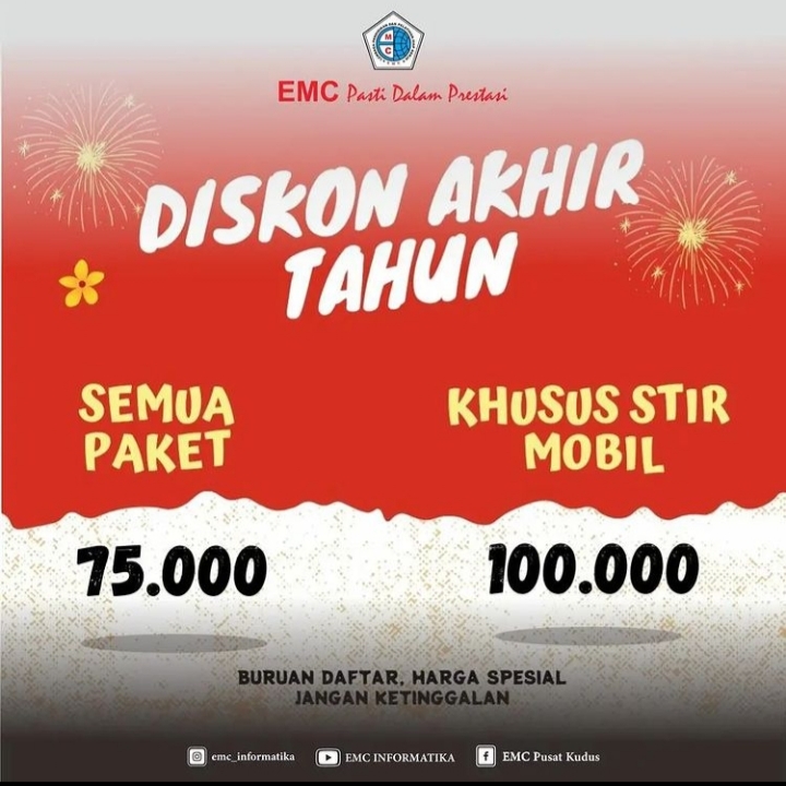 Kursus Stir Mobil di EMC INFORMATIKA merupakan pelatihan dalam hal keterampilan mengemudi mobil. Pelaksanaannya dilakukan secara privat. Praktek langsung di jalan raya, eits jangan khawatir ya, pastinya kalian didampingi oleh instruktur professional. Kalian bisa pilih paket plus sim atau tanpa SIM ya guys. Ada juga pilhan paketnya, yaitu : Paket Manual + SIM Paket Manual Paket Manual Matic + SIM Paket Manual Matic Paket Matic + SIM Paket Matic Nah jadi setelah kalian mengikuti kursus stir mobil, bisa mendapatkan SIM sesuai dengan prosedur yang ada, dan sudah memenuhi persyaratan dalam pembuatan SIM. Jadi kalian bisa bebas pergi kemana aja nih stir mobil sudah lancar, SIM sudah ada, apalagi sertifikat dari Lembaga pasti dapat ya guys, paket lengkap sudah. Makanya segera daftar Stir Mobil di EMC INFORMATIKA Kudus